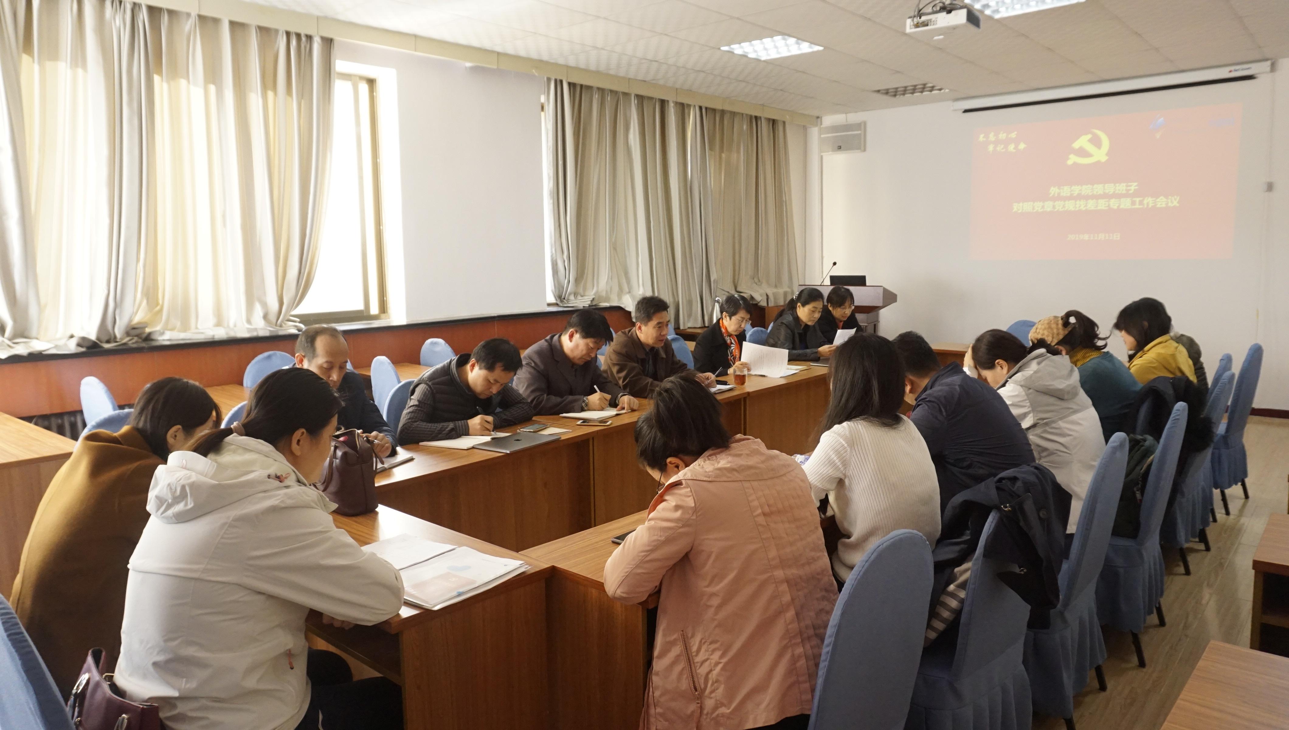 按照学校党委关于主题教育的安排部署,11月11日下午,外语学院领导班子在博文楼312召开对照党章党规找差距专题会议,学院党委书记王传永主持会议,学院领导班子成员、党委委员、各支部书记、各系、办主任参加会议。