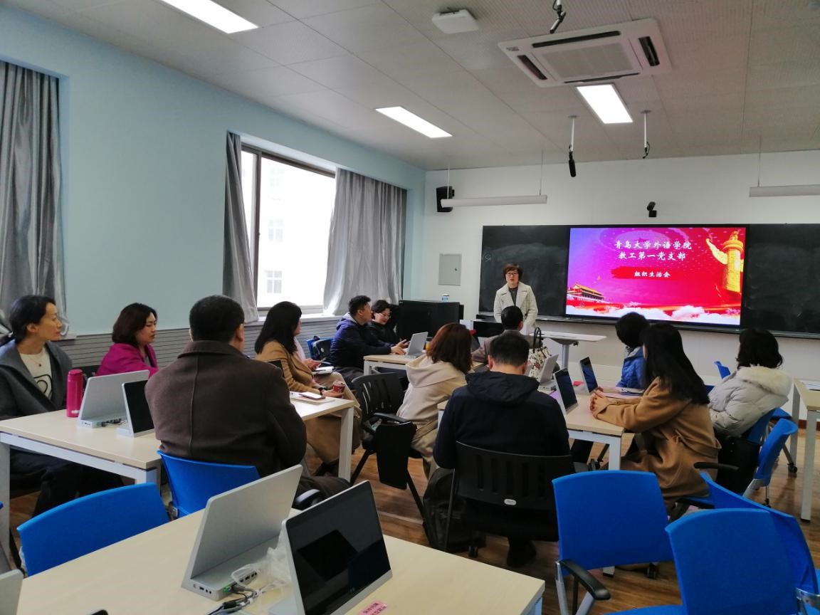 2021年3月11日下午,青岛大学外语学院教工第一党支部党员教师齐聚博文楼416教室,召开组织生活会并进行党员民主评议工作。王薇同志主持会议,外语学院党委副书记、院长卞建华同志列席会议,现场交流指导基层党建工作。