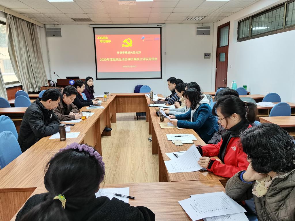 3月15日下午,外语学院机关党支部在博文楼312会议室召开2020年度专题组织生活会及民主评议党员工作会,会议由党支部书记华登峰主持,全体党员参加会议,院党委委员、院长助理曹杉同志列席指导。