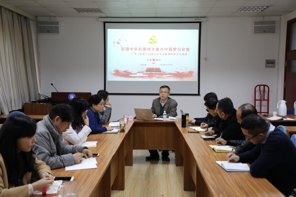 肖江南以《实现中华民族伟大复兴中国梦与你我》为题,介绍了十九届五中全会召开的历史背景,解读了十九届五中全会的重大意义、重大成果和主要内容,并就如何结合学校、学院、学科实际和个人发展做好会议精神贯彻落实,提出了明确要求,指明了努力方向。他强调,学习宣传贯彻党的十九届五中全会精神,是当前和今后一个时期的重要政治任务。学院要以这次学习为契机,深入思考如何将会议精神贯彻落实在学院“十四五”规划中,系统谋划如何在综合性大学办好外语学科,认真总结归纳博士点申报的不足和经验,理清学院、学科发展思路。他要求,要凝练、培育特色与优势方向,围绕方向引人才、做科研、育新人,开展有组织的学科建设与科研活动,从而实现有特色、有影响力、有成果的内涵式发展,把为党育人、为国育才的使命担当落在实处。