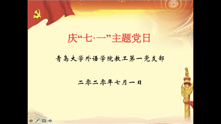 7月1日上午,青岛大学外语学院教工第一党支部召开钉钉视频会议,共同庆祝中国共产党建党99周年。本次主题党日活动由党支部书记王薇主持。