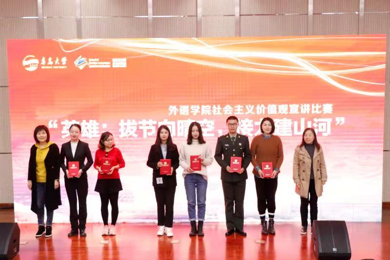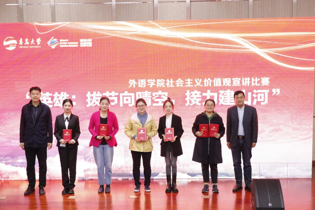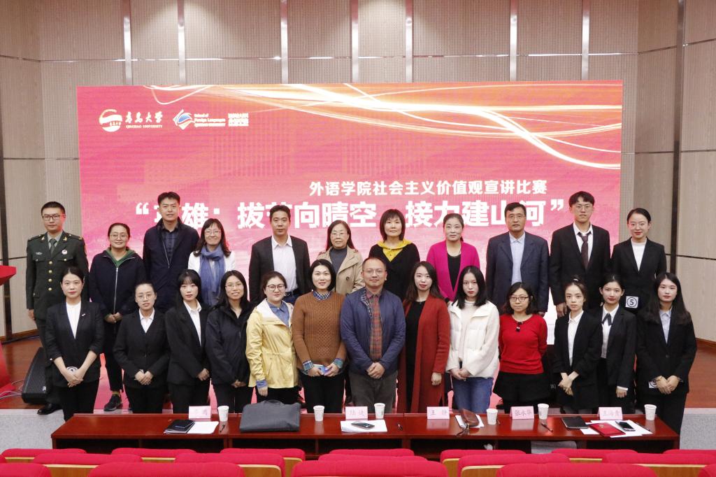 11月16日,由外语学院党委主办、外语学院习近平新时代中国特色社会主义思想研究会承办的“英雄:拔节向晴空,接力建山河”第四届社会主义核心价值观宣讲比赛决赛在青岛大学研发大楼会议中心305会议室成功举行。后勤党委书记王静、图书馆馆长陆捷、党委宣传部副部长张永华,校团委副书记李鹏、外语学院党委书记王传永、党委副书记王海青出席比赛并担任评委。外语学院学工办主任崔玲、团委书记米娟、辅导员、学生党员、入党积极分子200余人到场观摩学习。