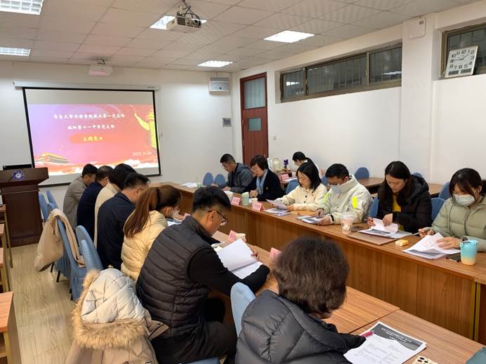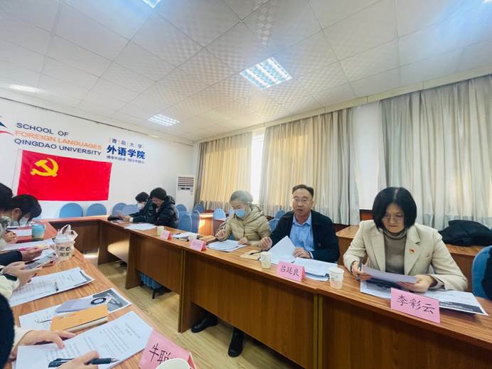 2023年11月30日下午,青岛城阳十一中学党支部一行6人来到青岛大学外语学院,与外语学院教工第一党支部共同举行主题党日活动,就共建“一带一路”倡议十周年、高等教育和义务教育阶段的教育思想展开交流。城阳第十一中学党支部书记李彩云、党支部副书记吕廷良校长、支部委员周春光、郭竹红、党员代表李超、王飞谷同志,外语学院教工第一党支部全体党员,以及研究生党员代表、学科教学(英语)23级研究生张文馨参加本次党日活动。