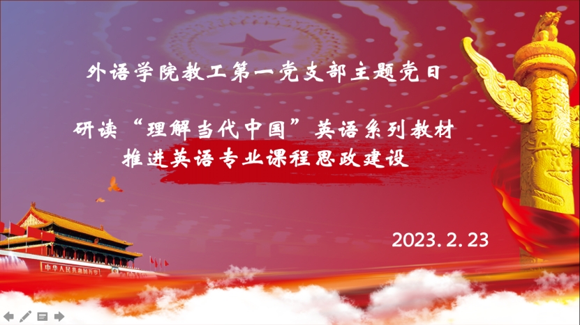 2023年2月23日下午,外语学院教工第一党支部举行了新学期第一次主题党日活动,主题为“研读‘理解当代中国’英语系列教材、推进英语专业课程思政建设”,此次活动由教工第一党支部书记王薇同志主持,外语学院党委副书记、院长卞建华同志和英语系、英语教育系教工党员参加,对“理解当代中国”英语系列教材融入英语专业课堂教学进行交流研讨。