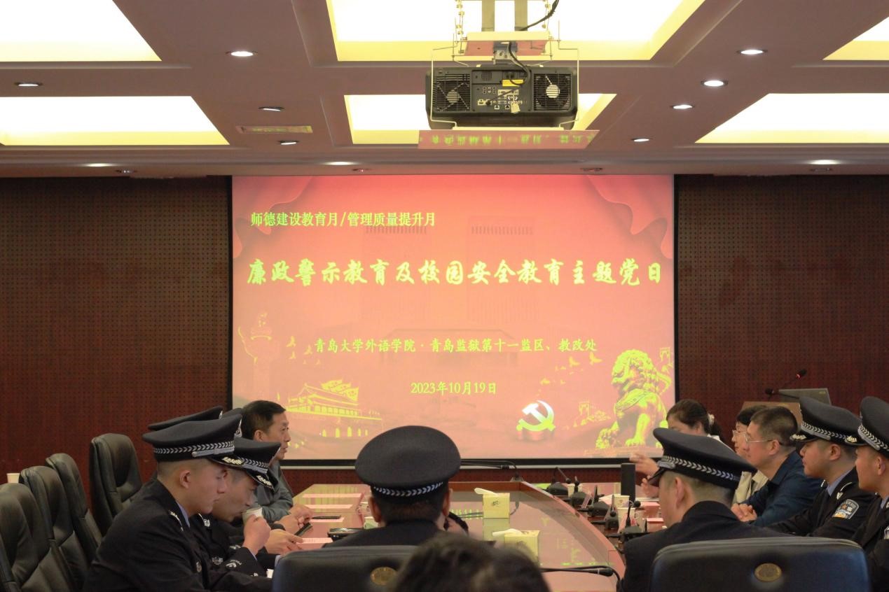 10月是外语学院师德建设活动月及管理质量提升月,青岛监狱第十一监区、教育改造处讲师为所有参与活动人员进行廉政警示教育及校园防诈骗安全主题宣讲。