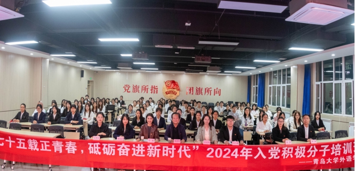 为深入学习贯彻习近平新时代中国特色社会主义思想和党的二十届三中全会精神,做深做实做细学院党员发展工作,提升学生党员发展质量,并严格把好党员发展入口关。外语学院于2024年11月12日晚,在浮山校区大学生活动中心205会议室举行“七十五载正青春,砥砺奋进新时代”2024年秋季学期入党积极分子培训班开班仪式。院党委书记陈崇研、院党委副书记于苗、学生党支部书记及97名入党积极分子出席开班仪式,会议由培训班班主任、学生第四党支部书记刘浩主持。