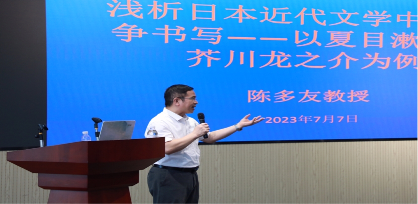 2023年7月7日上午9:00—11:30,广东外语外贸大学日语语言文化学院名誉院长、教授、博士生导师、广东外语外贸大学东方学研究院院长、中国日语教学研究会会长、教育部高等学校外国语言文学类教学指导委员会日语分委员会委员陈多友教授应邀为外语学院日语系师生带来了题为“浅析日本近代文学中的战争书写——以夏目漱石、芥川龙之介为例”的精彩学术讲座。本次讲座在青岛大学会议中心404举行,外语学院日语系杜雪丽副主任主持,日语系杨剑主任、张科蕾学科负责人、杨志华老师等师生以及外语学院其他语系的师生共计100余人参加。