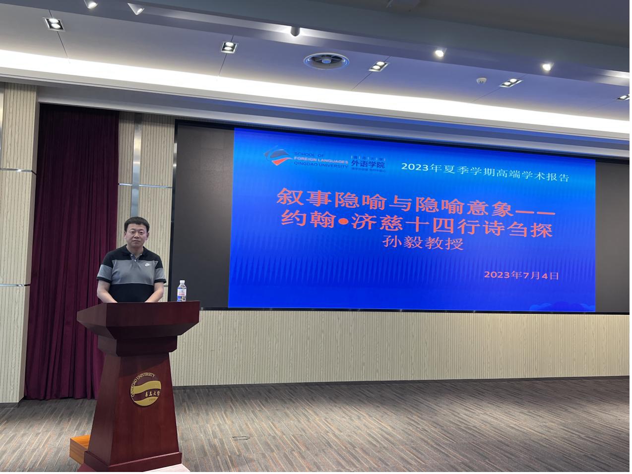 2023年7月4日下午2:00—4:00,广东外语外贸大学教授、博士生导师、广东外语外贸大学云山杰出学者、《广东外语外贸大学学报》主编孙毅教授应邀为外语学院师生作了题为《叙事隐喻与隐喻意象——约翰·济慈十四行诗刍探》的学术讲座。本次学术讲座由外语学院卞建华院长主持,外语学院百余名师生参加了此次讲座。