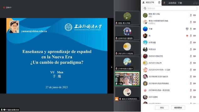 2023年6月27日下午2:00—4:00,上海外国语大学西方语系主任、教育部外国语言文学类专业教学指导委员会委员、西班牙语分委员会副主任委员、RAE-SISU联合研究中心主任、拉丁美洲社会科学理事会理事于漫教授应邀为外语学院西班牙语系师生开展了题为“新时代西班牙语的教与学:会发生范式的转变吗?”的线上讲座。本次会议由外语学院西班牙语系主任陈皓主持,西班牙语系教师,学生,以及外语学院其他系的同学约280人次参加了讲座。