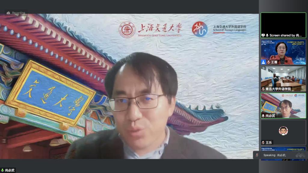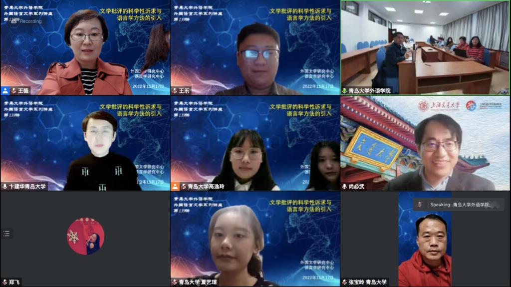 2022年11月17日晚,上海交通大学外国语学院尚必武教授应邀为青岛大学外语学院师生带来题为“文学批评的科学性诉求与语言学方法的引入”的精彩学术讲座。此次讲座由外国文学研究中心与语言学研究中心联合承办,外国文学研究中心主任王薇主持,青岛大学外语学院院长卞建华、副院长宫英瑞、副院长布占廷、英语教育系主任黄芳、语言学研究中心主任王乐等教师,以及来自全国各地的百余名师生线上、线下参与了此次学术活动。