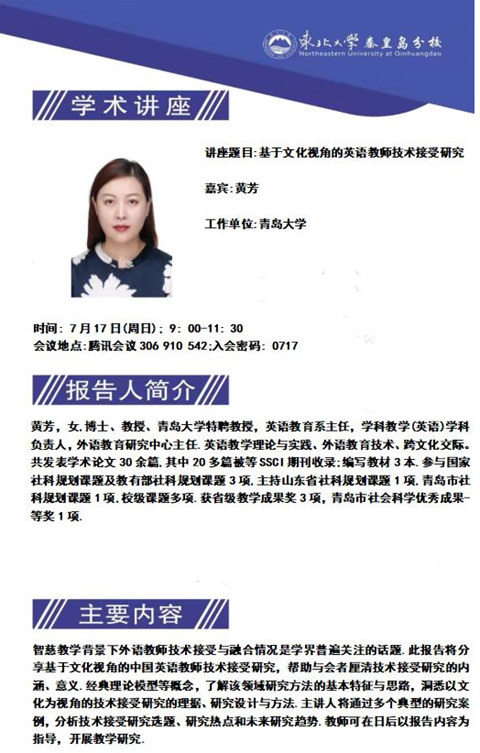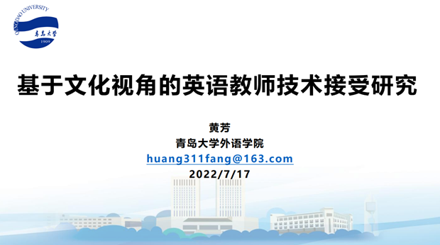2022年7月17日上午,黄芳教授应邀为东北大学秦皇岛分校外国语言文化学院的师生做了题为《基于文化视角的英语教师技术接受研究》的学术讲座。此次讲座由惠良虹教授主持,以腾讯会议的方式进行,吸引了东北大学秦皇岛分校及其他院校的百余名师生参加。东北大学秦皇岛分校外国语言文化学院赵玉容院长及青岛大学外语学院的部分研究生也参加了讲座。