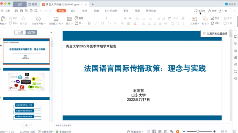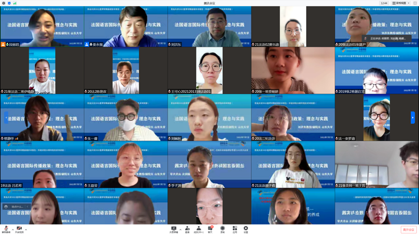7月7日上午9:30-11:30,山东大学外国语学院法语系刘洪东教授应邀为青岛大学外语学院师生带来了题为“法国语言国际传播政策:理念与实践”的线上学术讲座。此次讲座属于本年度我校夏季学期高端学术报告和教师发展中心名师讲坛,也是外语学院20周年院庆系列报告之一。此次讲座由外语学院副院长娄永强教授主持,校内外师生300余人参加。