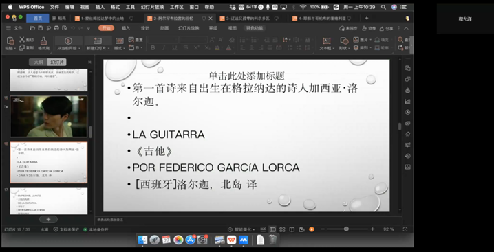 讲座开始,程弋洋教授以“爱斯梅拉达梦中的土地”、“阿尔罕布拉宫的回忆”、“辽远又孤零的科尔多瓦”等多个主题,生动介绍了西班牙南部城市的文化风情与历史往事。程弋洋教授多次朗读诸如洛尔加、博尔赫斯等诗人的优美诗篇让讲述更具感染力,使那些传奇、故事更加美丽动人。