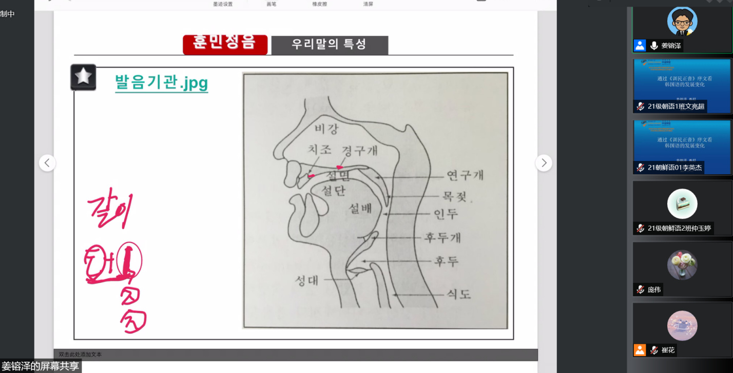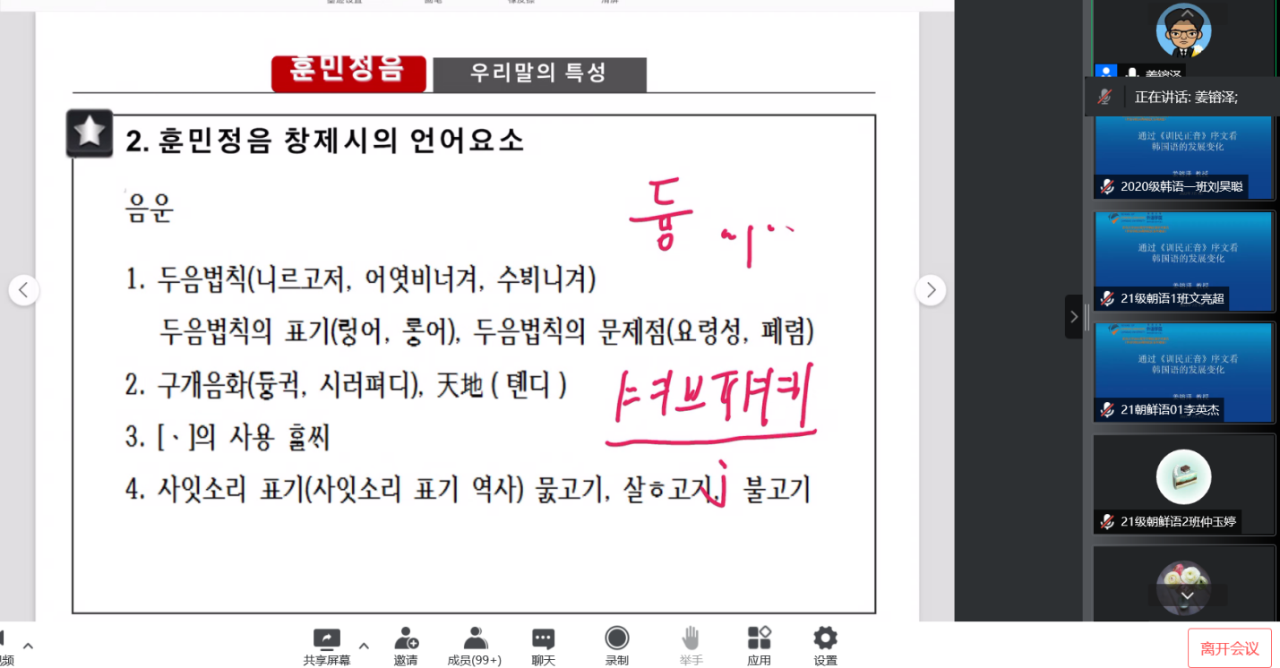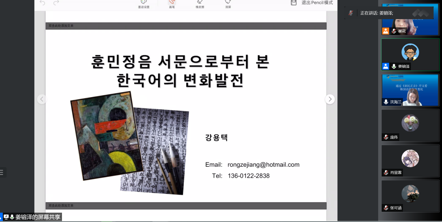 7月4日下午,中央民族大学中国少数民族语言文学学院姜镕泽教授应邀为外语学院朝鲜语系师生带来了题为“通过《训民正音》序文看韩国语的发展变化”的精彩学术讲座。此次讲座由朝鲜语系主任崔花老师主持,朝鲜语系多位老师以及全院学生通过腾讯会议参与了本次讲座。