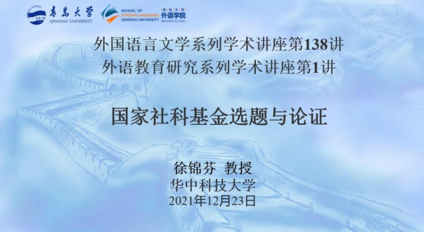 12月23日晚,华中科技大学徐锦芬教授为外语学院师生带来了题为“国家社科基金选题与论证”的线上讲座。这是外国语言文学系列学术讲座第138讲,也是“外语教育研究系列学术讲座”的第一讲。讲座由英语教育系主任、外语教育研究中心主任黄芳教授主持,外语学院卞建华院长、布占廷副院长、宫英瑞副院长和外语学院的众多师生参加了此次学术讲座。
