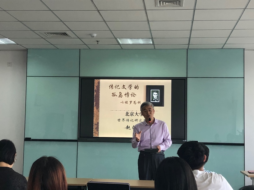 讲座伊始,赵教授通过幽默风趣地讲述自己与教堂山北卡罗来纳大学间的趣闻轶事,拉近了与在场听众的距离。随后,赵教授明确指出了文学中的三类重要分类——虚构文学、纪实文学,以及处于虚构文学与纪实文学之间的交叉文学,并强调,作为纪实文学的一种,传记文学十分重要且值得人们关注、研究与广泛推广。