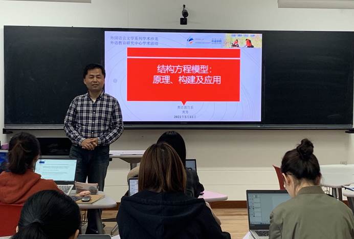 2021年5月11日下午,外语学院于博文楼413举办了“结构方程模型:原理、构建及应用”工作坊,此次学术活动是外国语言文学系列学术沙龙第18讲、外语教育研究中心第2次学术活动。工作坊由布占廷副院长主持,英语教育系主任、外语教育研究中心主任黄芳教授主讲,外语学院部分老师和研究生参加了参与此次学术活动。