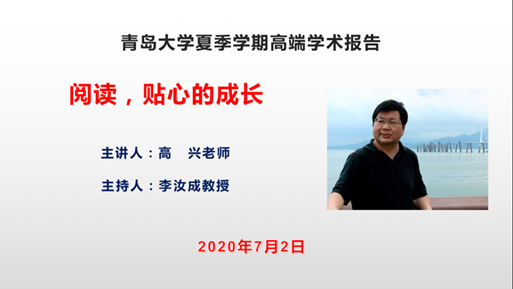 2020年7月2日下午,青岛大学外语学院特邀诗人、翻译家、《世界文学》主编高兴老师,为师生们带来题为《阅读,贴心的成长》的精彩讲座。该讲座由李汝成教授主持,二百余名外语学院师生通过腾讯会议平台参与了此次讲座。