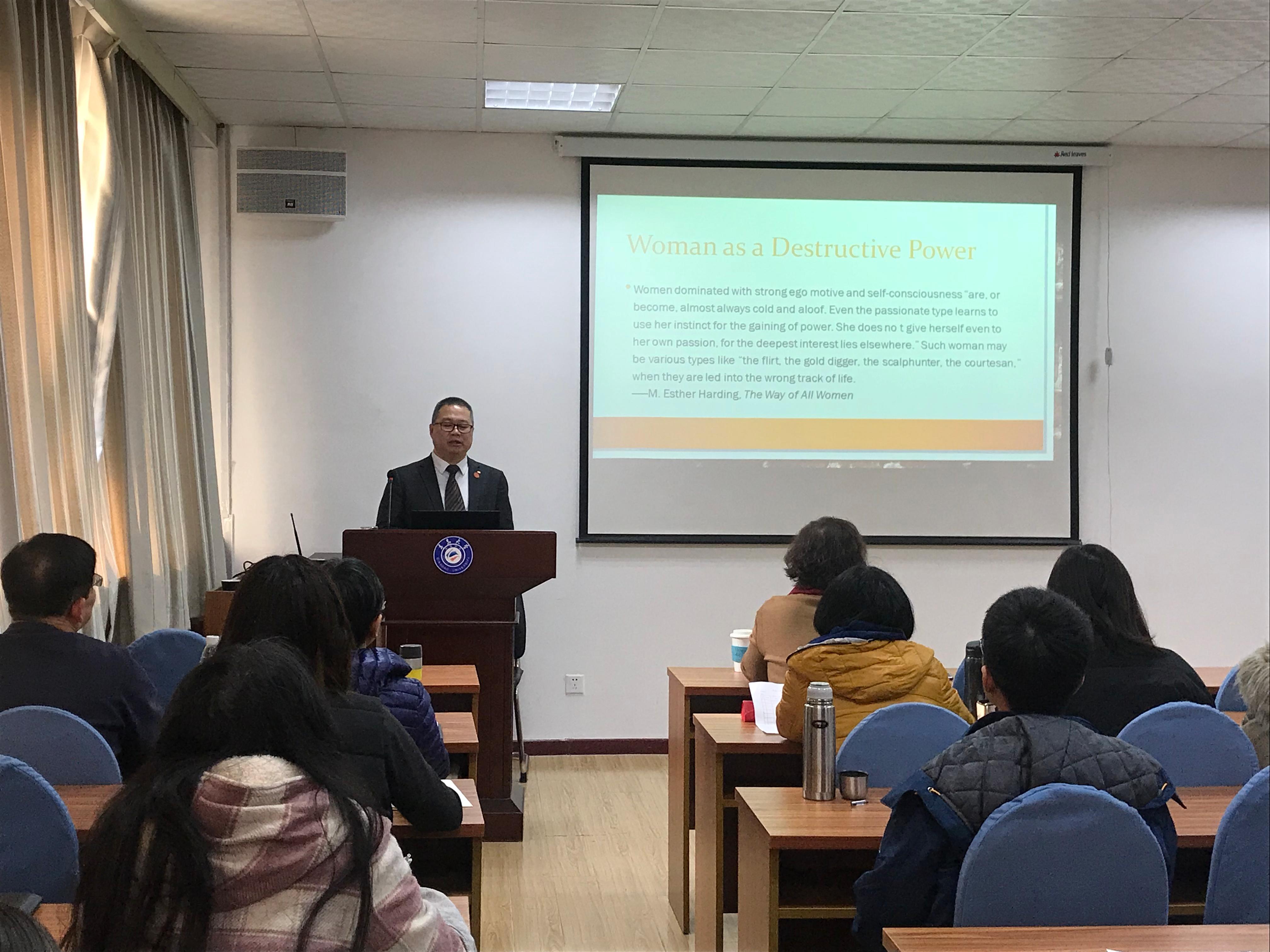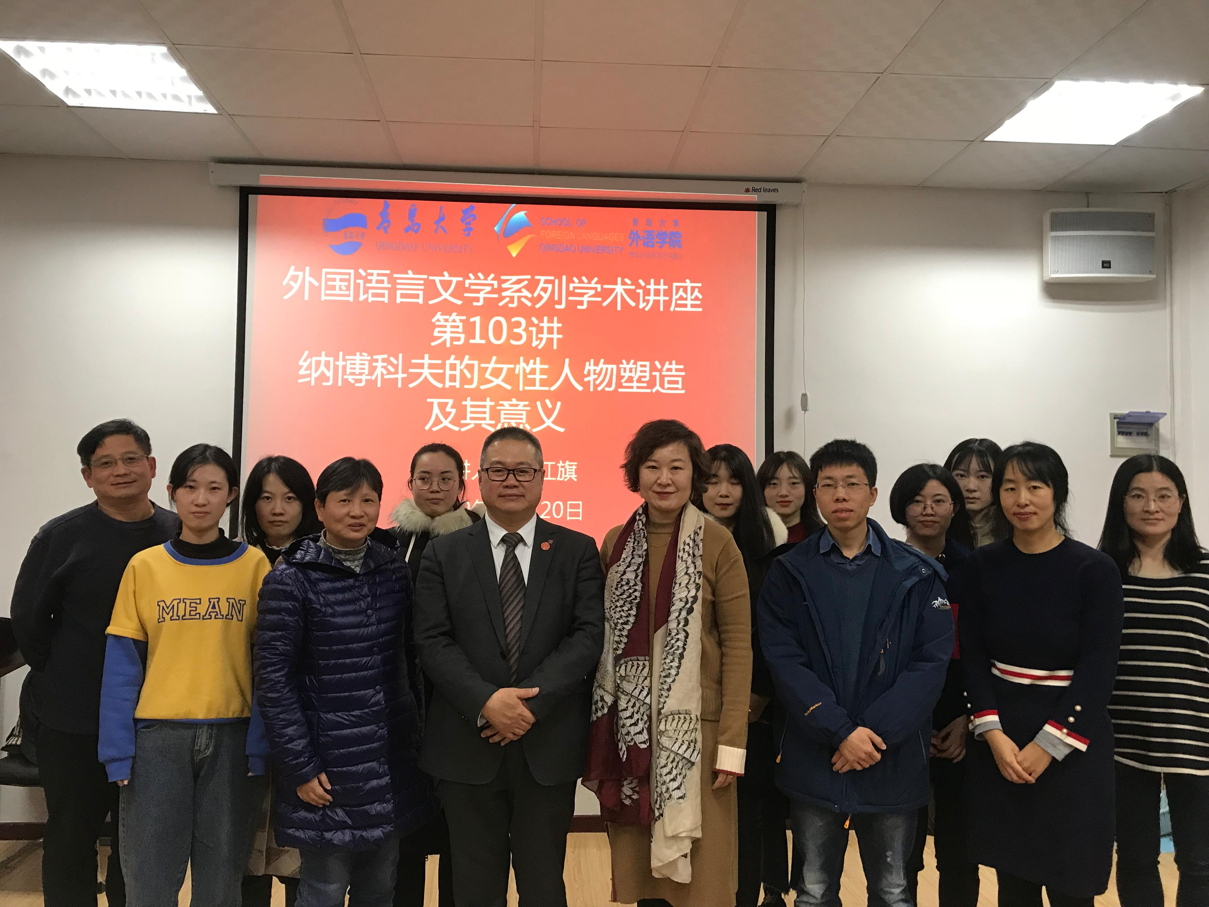 12月20日下午,南开大学外国语学院副院长、博士生导师马红旗教授应邀为青岛大学外语学院师生带来了题为“纳博科夫的女性人物塑造及其意义”的精彩学术讲座。此次讲座由外语学院副教授王薇老师主持,外语学院院长卞建华教授、日语系于华教授以及外国语言文学专业师生出席讲座。