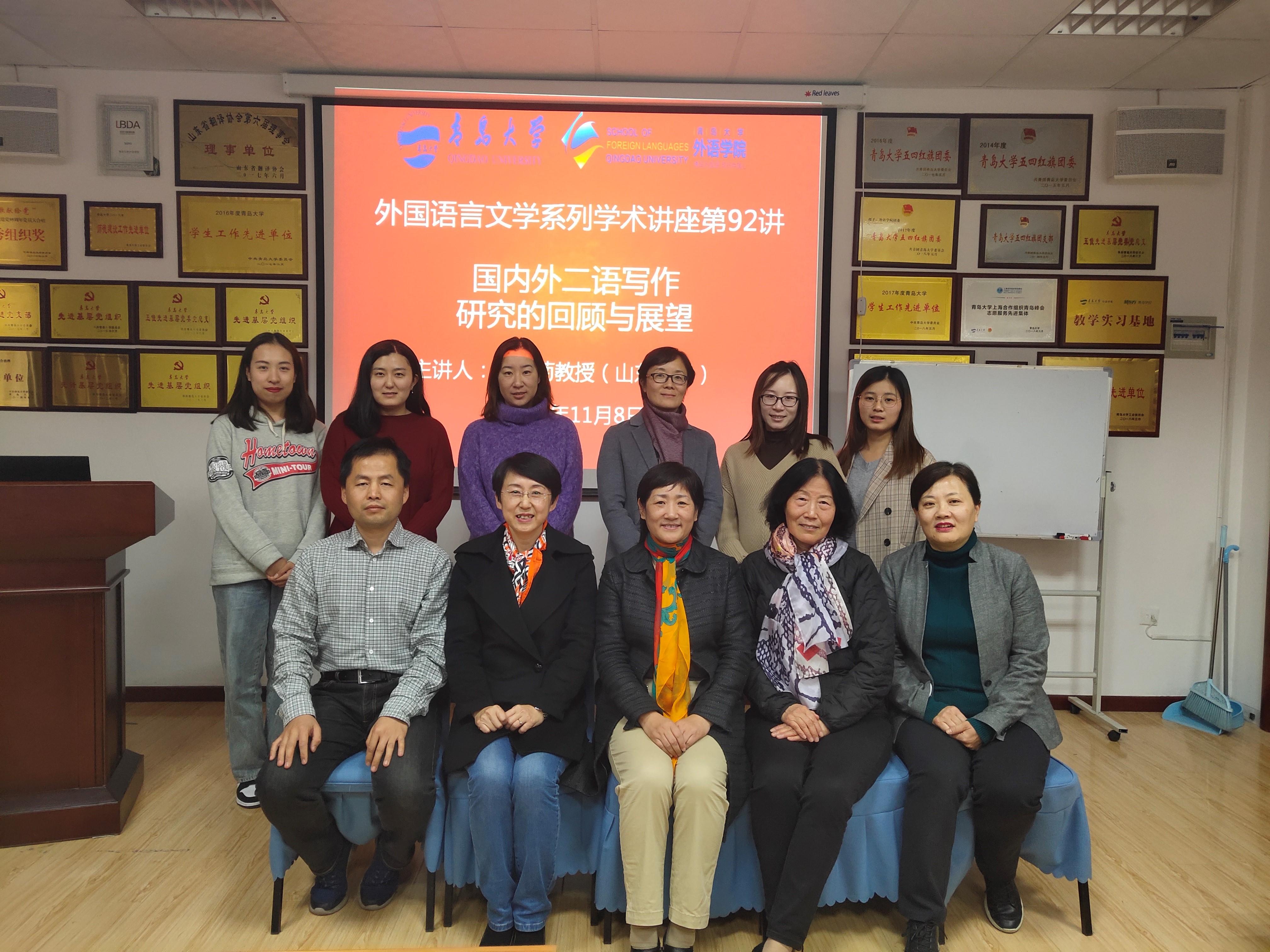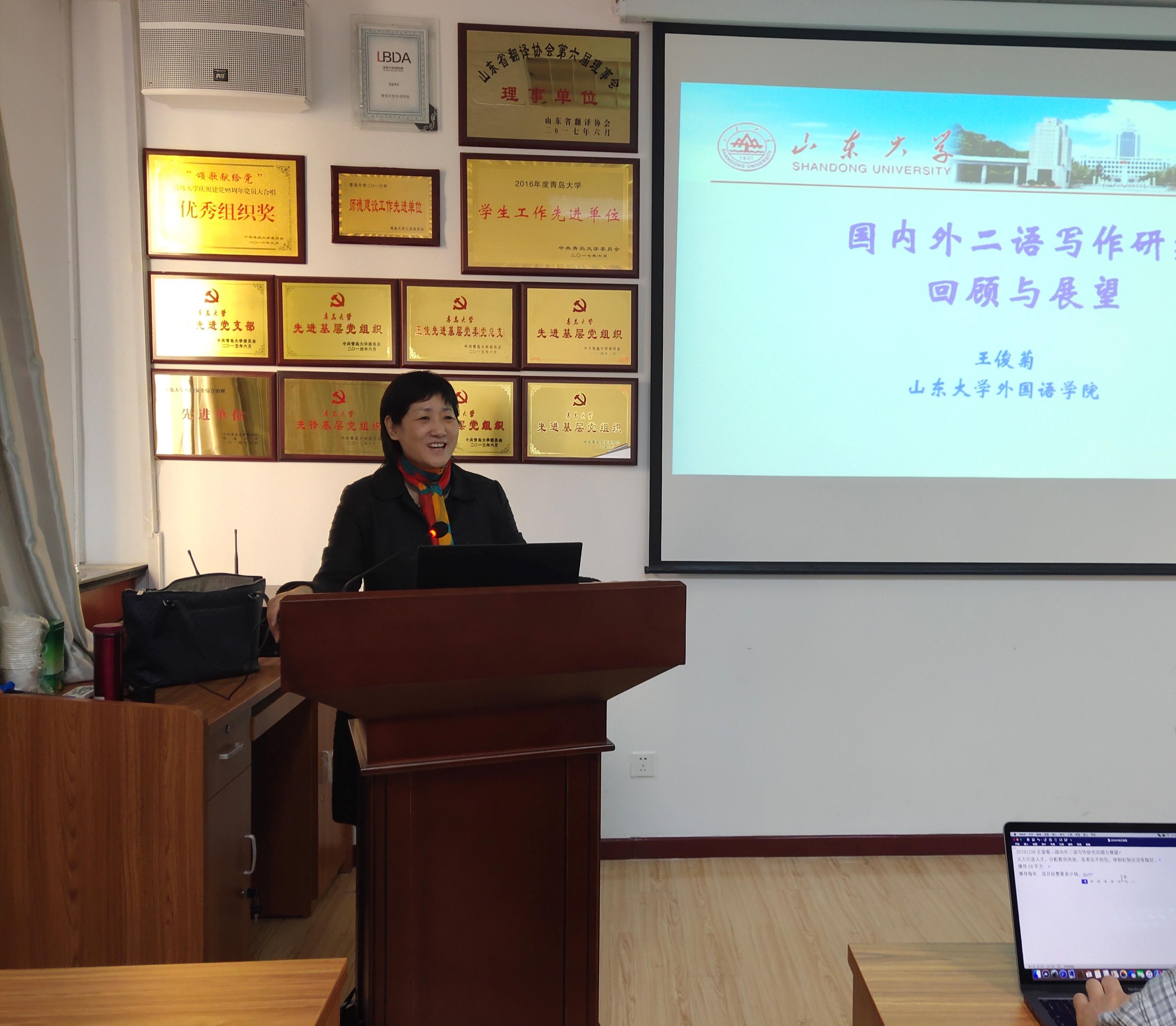 2019年11月8日,山东大学特聘教授王俊菊在博文楼312室为外语学院师生带来了题为“国内外二语写作研究的回顾与展望”的精彩学术讲座。此次讲座由外语学院院长卞建华主持,外语学院副院长布占廷以及孙旻、王曼等老师和外语学院部分学生出席了讲座。