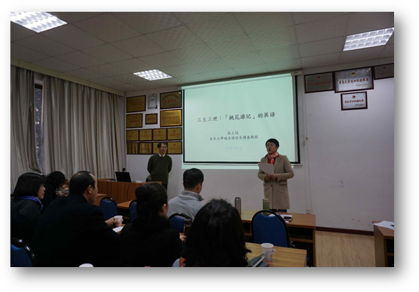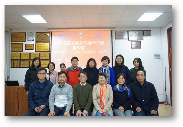 12月3日下午,外语学院在博文楼312会议室举行“外国语言文学系列学术讲座”第58讲。翻译理论及文化研究著名台湾学者张上冠教授应邀作“三生三世:《桃花源记》之英译”的专题学术讲座。院长卞建华主持讲座,学院部分老师及研究生参加此次讲座。