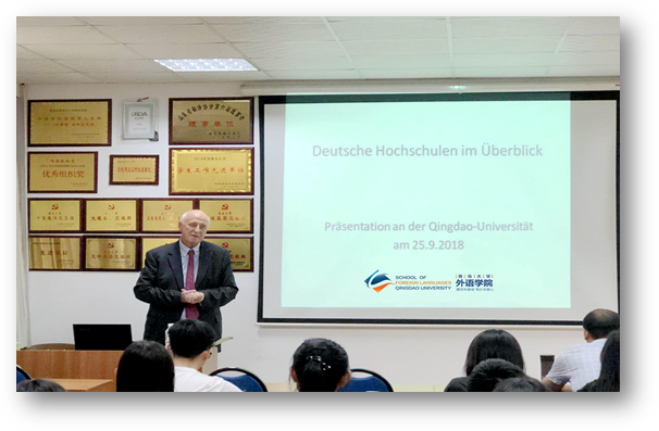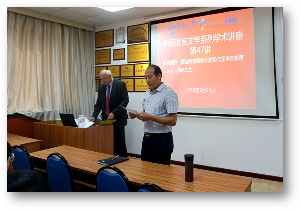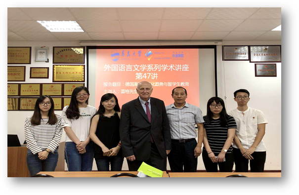 9月25日下午,德国弗里茨-蒂森基金会董事会前主席雷格先生应邀主讲外语学院外国语言文学系列学术讲座第47讲,在博文楼312会议室举行作题为《德国高校国际化趋势与留学生教育》主题讲座。德语系主任綦甲福教授主持,德语系50余人聆听了本次讲座。