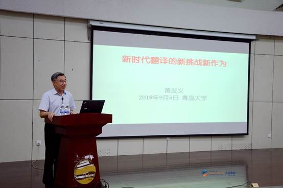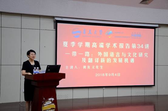 9月5日上午,外语学院在图书馆报告厅举行夏季学期高端学术讲座第34讲。中国译协常务副会长、著名翻译专家黄友义先生应邀作“新时代翻译的新挑战新作为”的高端学术讲座。卞建华院长主持,全校师生270余人聆听了讲座。