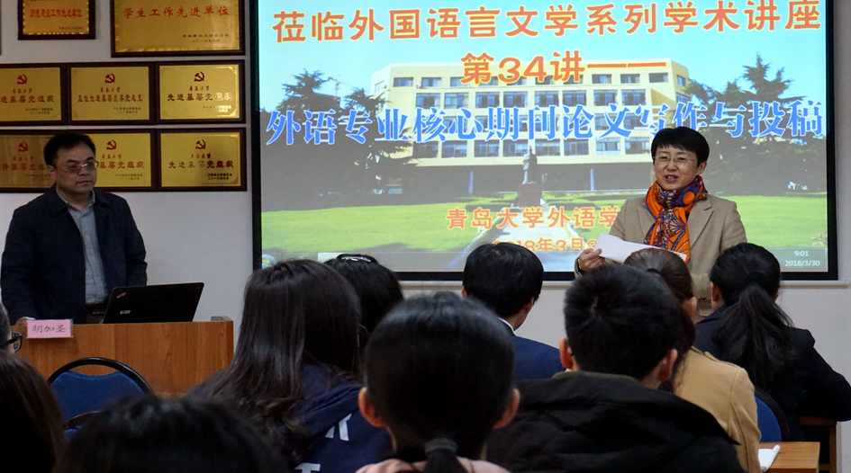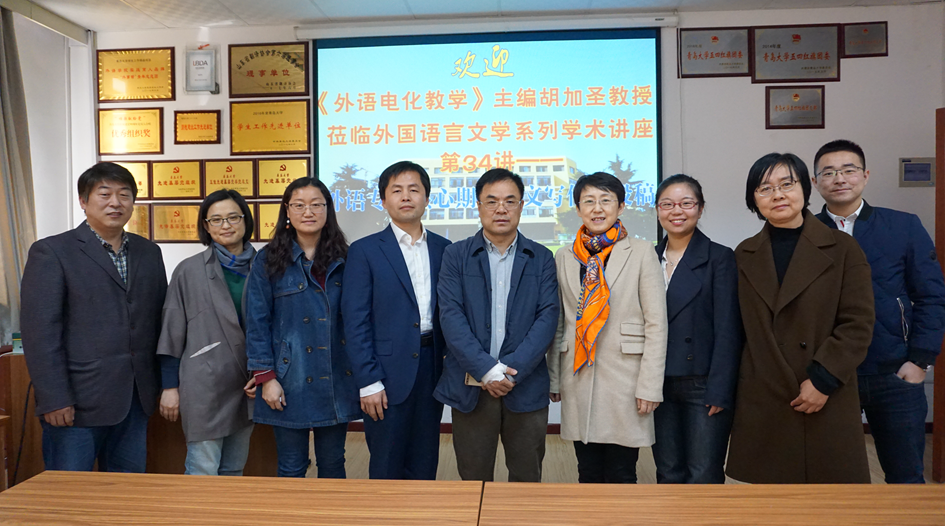 3月30日上午,上海外国语大学《外语电化教学》常务副主编、编辑部主任、上海外语音像出版社社长胡加圣教授应邀做客外语学院“外国语言文学系列学术讲座”第34讲,并在博文楼312会议室作《外语专业核心期刊论文写作与投稿》的专题讲座。卞建华院长主持。副院长李明学、院长助理布占廷、部分中青年教师以及学院部分研究生共60余人聆听了讲座。