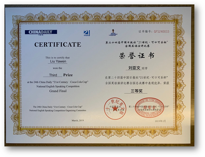 我校外语学院英语演讲协会2016级中外英语专业刘亚文经过校园选拔赛、省赛一路过关斩将,最终荣获山东省特等奖并代表山东省和青岛大学参加了全国总决赛。经过三天的紧张比赛,刘亚文同学最终荣获全国总决赛三等奖,外语学院指导教师潘劲松荣获优秀指导教师称号,为青岛大学和外语学院赢得了荣誉 。