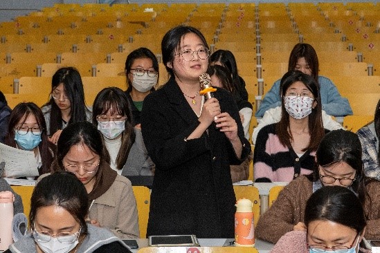 第二部分为教学设计头脑风暴。首先,青岛大学附属实验学校英语集备组的两位教师代表针对选定的授课内容分享了教学设计,从导入-课文讲解-中外文化对比等方面梳理教学思路,充分挖掘阅读文本,把握新课标中拓展学生国际视野,树立文化自信的教学目标要求。随后,青岛大学学科教学(英语)研究生何虹燕和徐倩同学代表发言,分享了自己对新课标的理解,以及与会心得和学习感悟。