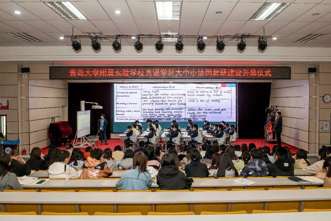 2023年4月3日下午,英语教育系部分本科生及学科教学(英语)研究生在青岛大学附属实验学校参加了“英语学科大中小协同教研建设开幕仪式暨2022版英语新课标研学会”。本次活动由青岛大学附属实验学校初中部主办,青岛大学附属实验学校初中部、小学部的英语教师、青岛大学外语学院学科教学(英语)2022级全日制研究生以及英语教育系2021级、2022级部分本科生共同参与了教研活动。
