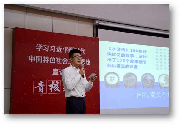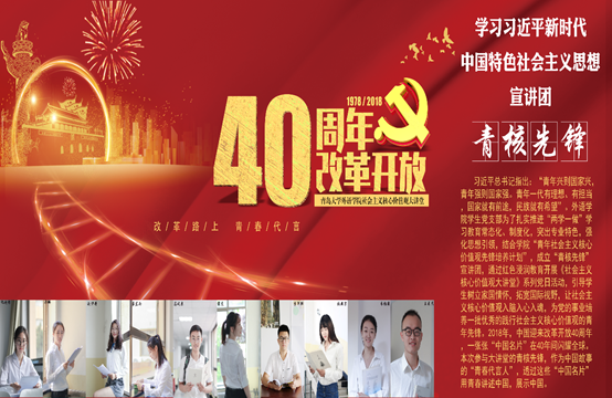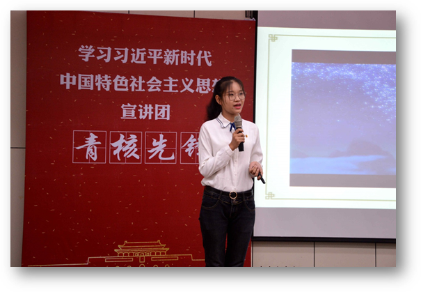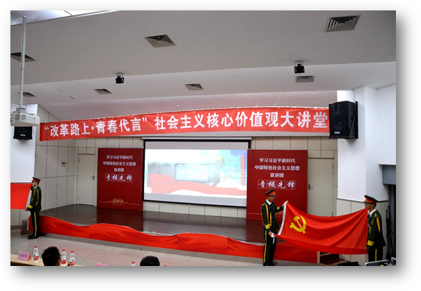 习近平总书记指出:“青年兴则国家兴,青年强则国家强。青年一代有理想、有担当,国家就有前途,民族就有希望”。外语学院学生党支部为了扎实推进“两学一做”学习教育常态化、制度化,突出专业特色,强化思想引领,结合学院“青年社会主义核心价值观先锋培养计划”,成立“青核先锋”宣讲团,通过红色浸润教育开展《社会主义核心价值观大讲堂》系列党日活动,引导学生树立家国情怀,拓宽国际视野,让社会主义核心价值观入脑入心入魂,为党的事业培养一批优秀的践行社会主义核心价值观的青年先锋。2018年,中国迎来改革开放40周年,一张张“中国名片”在40年间闪耀全球。本次参与大讲堂的青核先锋,作为中国故事的“青春代言人”,透过这些“中国名片”用青春讲述中国,展示中国。