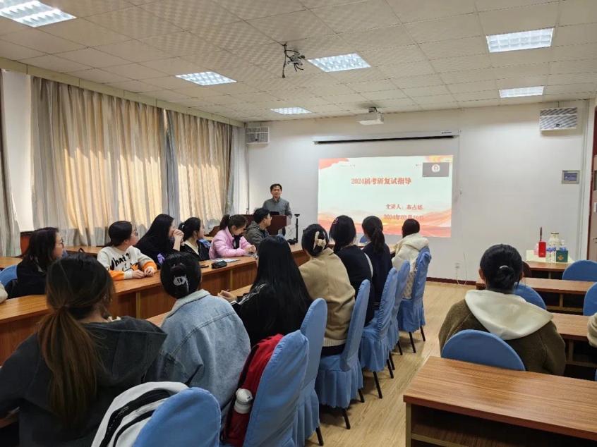 3月19日下午,外语学院于博文楼312室举办2024年考研复试指导讲座,由外语学院副院长布占廷主持。此次活动旨在为外院考研学子提供精准、高效的面试策略以及调剂信息,助力他们扬帆起航,顺利驶向学术的彼岸。