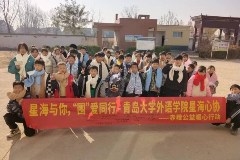 2023年冬天,青岛大学外语学院星海心理协会联合赤橙公益,面向青岛大学全体同学,发起“星海与你,‘围’爱同行”为主题的大学生织围巾志愿服务活动,在同学们和远方的小朋友们之间架起一座传递爱与温度的桥梁,用亲手织就的围巾传递人间大爱。