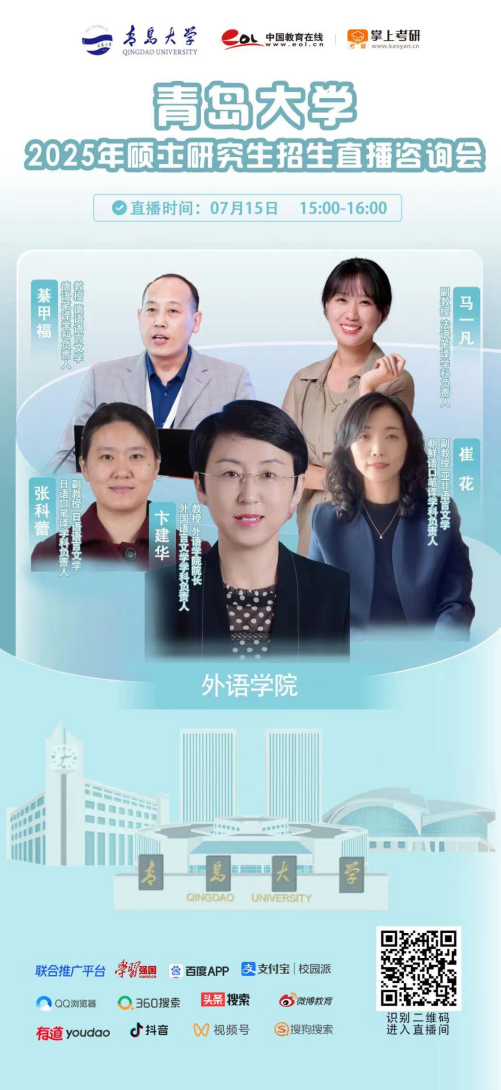 欢迎报考青岛大学外语学院,请用微信扫描海报中的二维码观看回放。