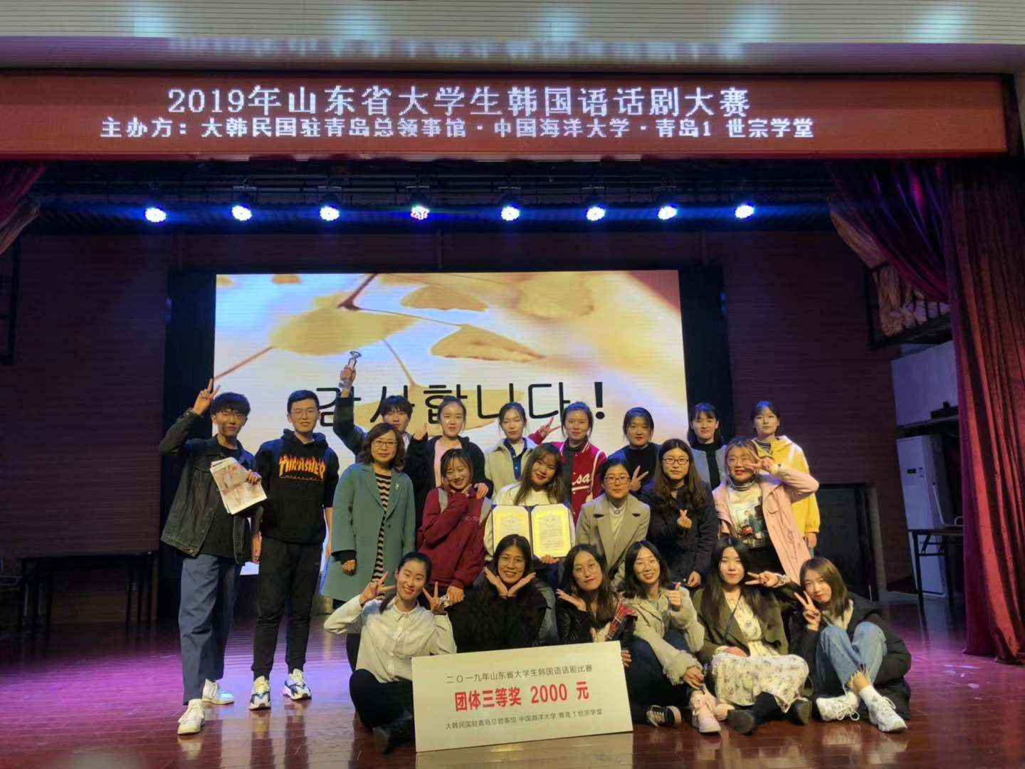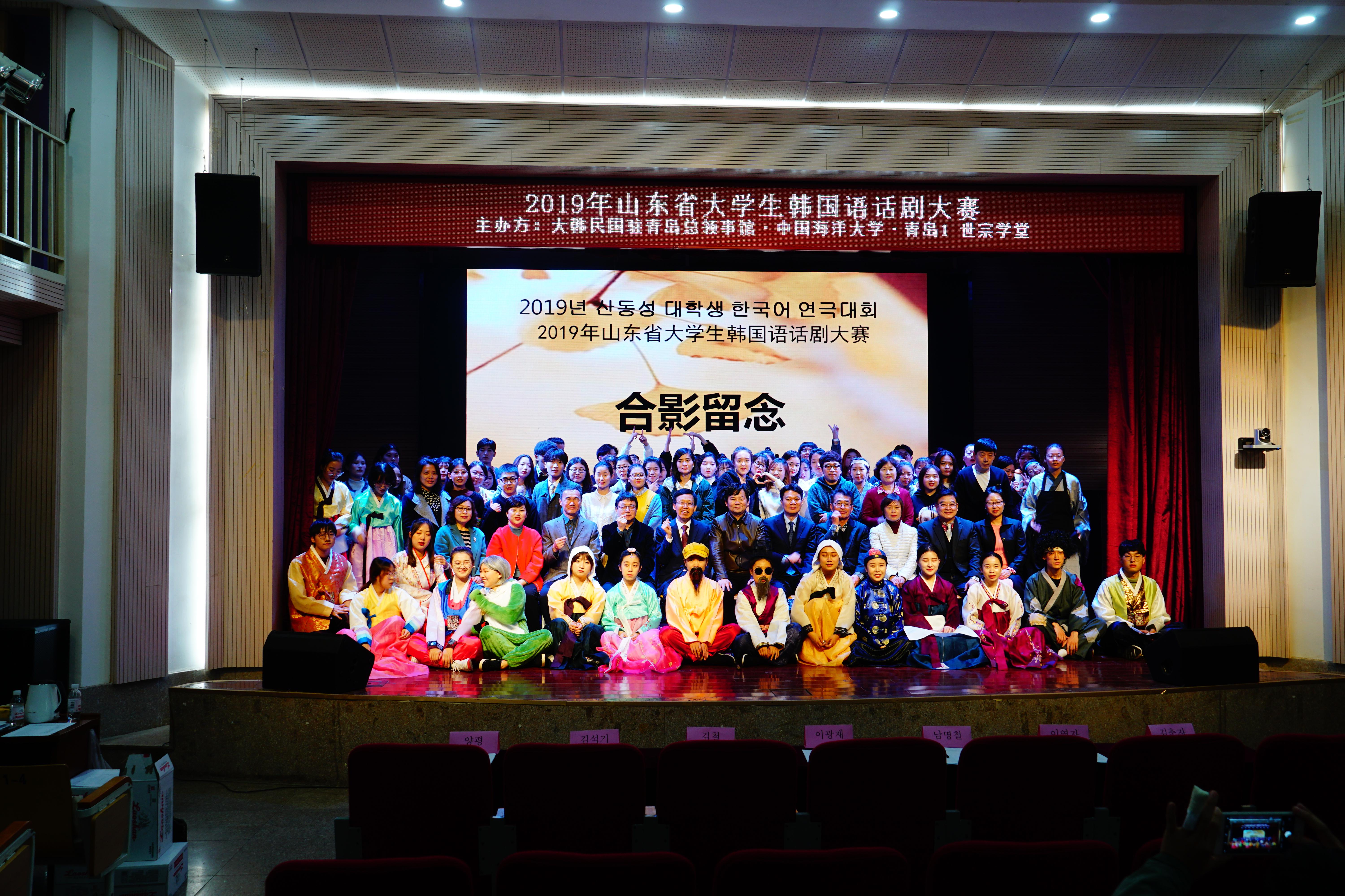 11月17日上午,由韩国驻青岛总领事馆、中国海洋大学、青岛1世宗学堂共同主办的2019年山东省大学生韩国语话剧大赛在中国海洋大学文学与新闻传播学院乐海堂拉开帷幕。韩国驻青岛总领事朴镇雄,文化教育领事郑润植等出席开幕式。我校参赛队伍在朝鲜语系沈海兰、张娜、李香芬老师带领下参加了此次话剧大赛。