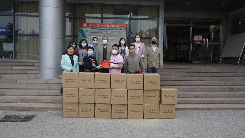 为助力母校做好常态化疫情防控与开学返校工作,5月26日,外语学院日语系96级校友、招远帝源服饰有限公司总经理李永胜向学院捐赠了2万只一次性医用级防护口罩。防疫物资捐赠仪式在博文楼前举行。院长卞建华向李永胜颁发了捐赠证书,学院党委书记王传永、党委副书记王海青,日语系主任杨剑以及学生辅导员等出席了捐赠仪式。