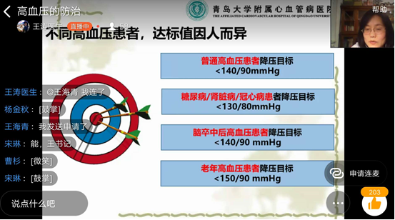 为关爱教职工身体健康,提高日常自我保健意识与能力,6月11日晚7时,外语学院分工会特邀青岛大学附属心血管医院副主任医师王涛为全院教职工作了题为“高血压的防治”的线上健康教育讲座。外语学院150余名教师及家人聆听了讲座。讲座由学院党委副书记王海青主持。