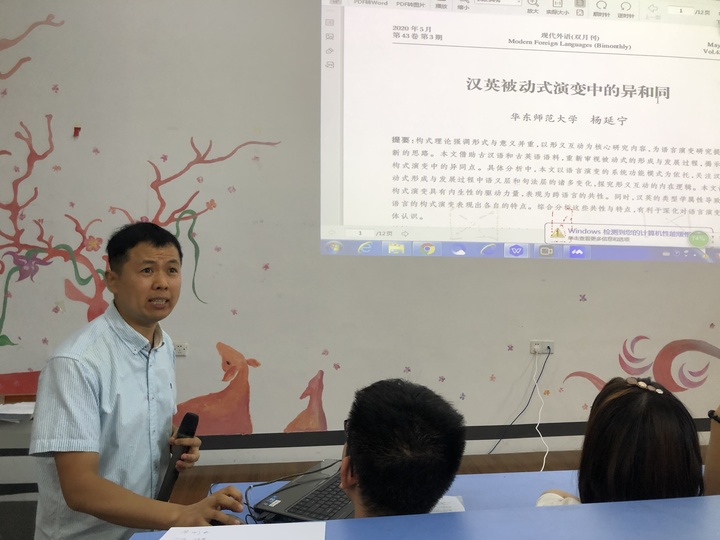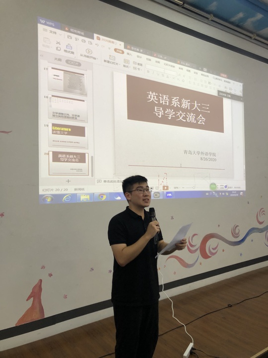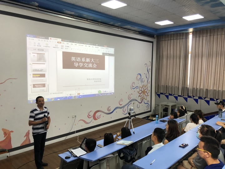 2020年8月26日下午,外语学院英语系新大三导学交流会在博文楼218阶梯教室成功举行。交流会上,英语系主任邢富坤、副主任王薇、李忠善、石灿四位老师以及四年级孙铭辰同学,为即将升入三年级的2018级同学们带来了一场承前启后、引发思考的新大三导学讲座。交流会由王薇老师主持,2019级同学通过网络直播同步收看,交流内容涉及语言学、翻译学、文学三个方面,深入浅出,环环相扣,受到师生们的一致好评。