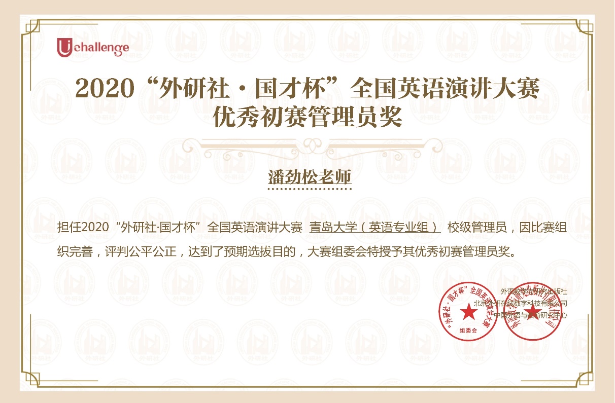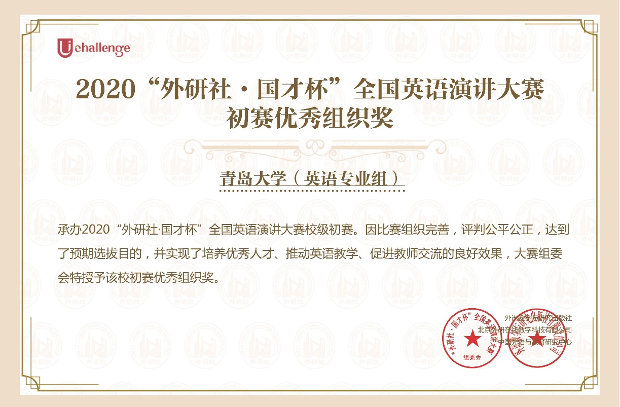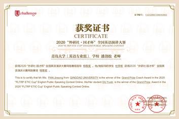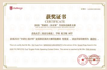 近日,在2020年“外研社·国才杯”全国英语演讲大赛(A类学科竞赛)全国总决赛中,外语学院2018级英语大数据班杜宇昕同学,经过激烈角逐,最终获得全国总决赛三等奖和网络赛场特等奖的好成绩,实现了英语系在此赛事上的历史性突破,潘劲松老师获得优秀指导教师和初赛优秀管理员奖,青岛大学获得初赛优秀组织奖。
