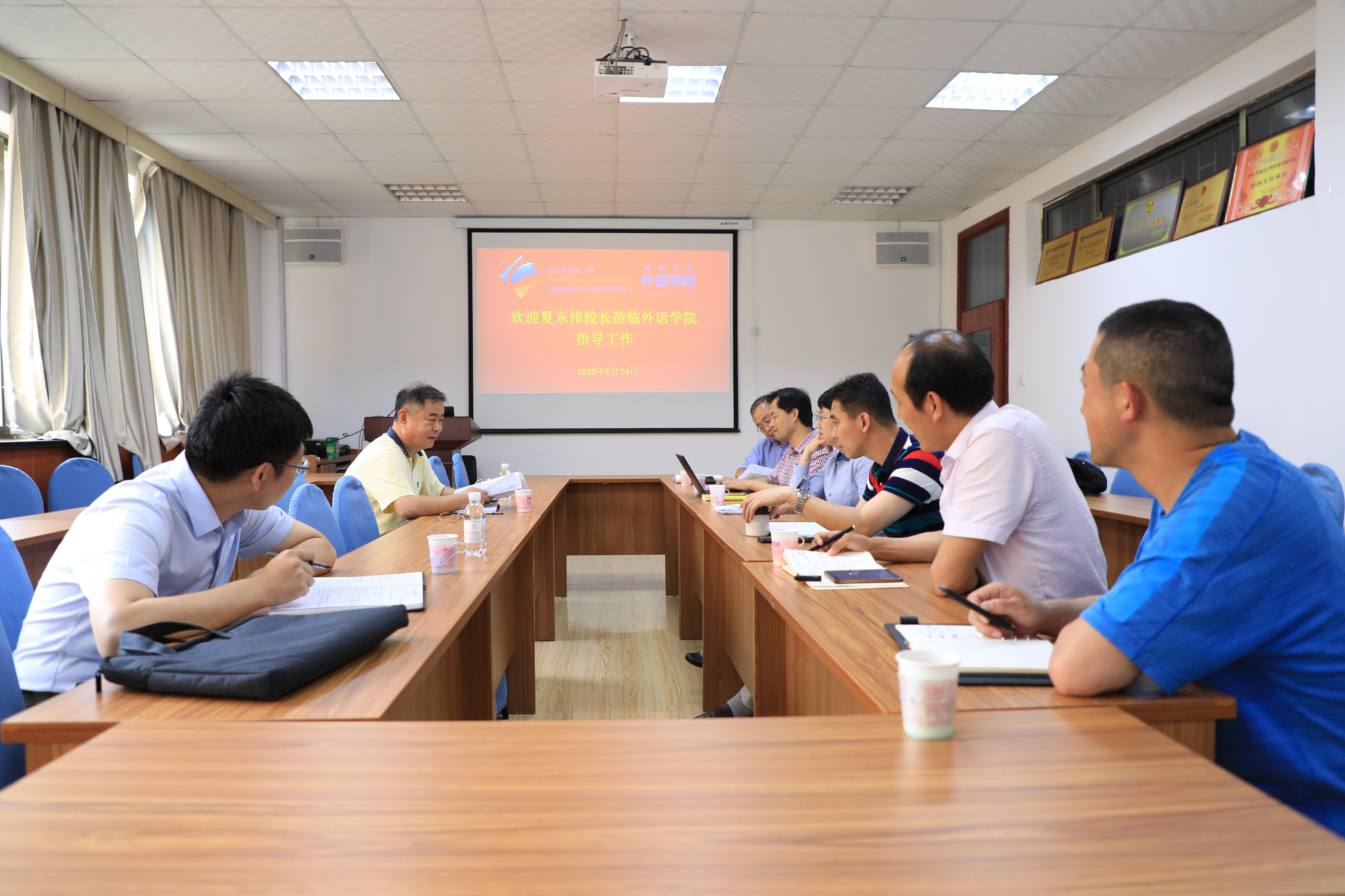 6月24日下午,校长夏东伟赴外语学院调研指导外国语言文学一级学科博士点申报工作。调研会由院长卞建华主持,院党委书记王传永、副院长布占廷、德语系主任綦甲福、普通英语系主任邢富坤参加调研交流。