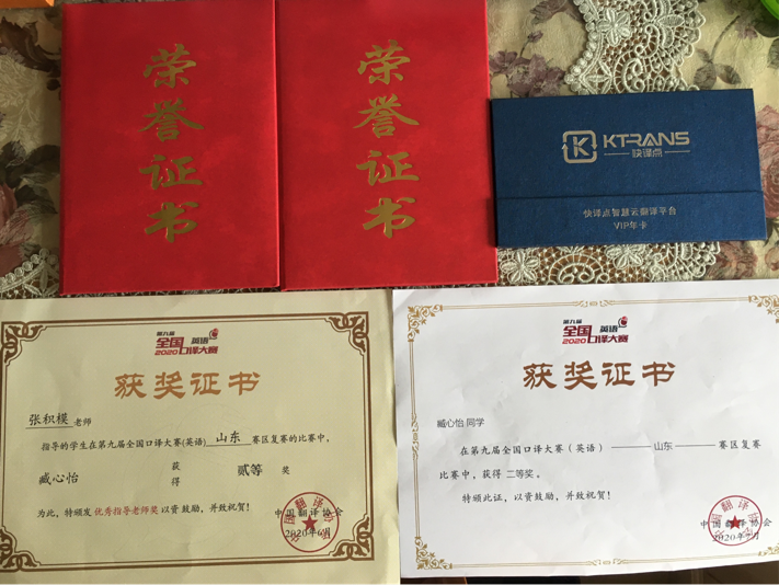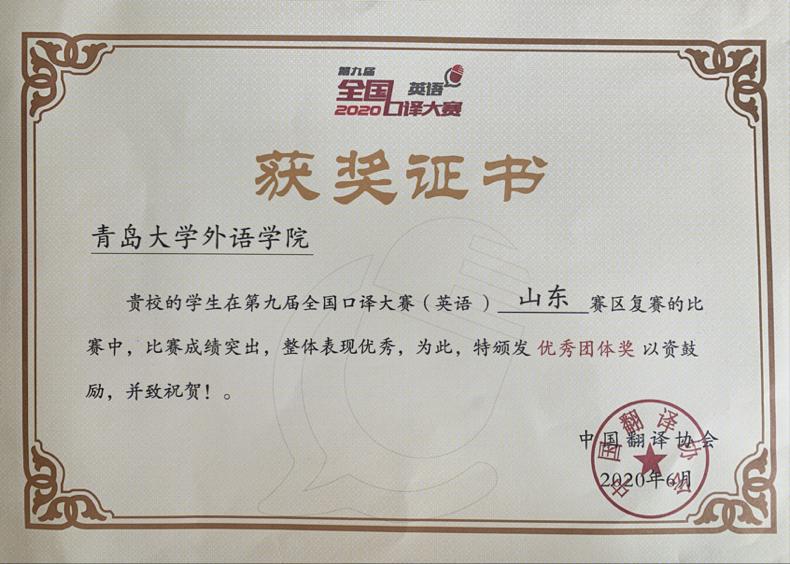 2020年第九届全国口译大赛(英语)山东赛区复赛于7月8日公布最终结果。我院共有4名口译方向研究生,1名本科生参加比赛,其中2019级研究生臧心怡获二等奖,青岛大学外语学院荣获优秀团体奖,张积模老师获优秀指导教师奖。另外,2019级研究生鞠晓颖、赵佳慧,2016级本科毕业生张蕴秋均获优秀奖。