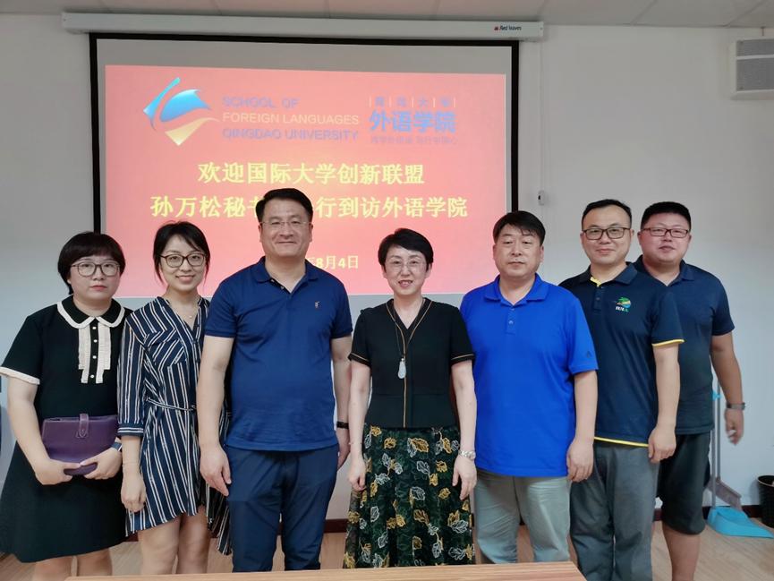2020年8月4日,国际大学创新联盟(IUIA)秘书长孙万松博士一行四人来我院访问交流,院长卞建华、副院长娄永强、西班牙语系副主任栾勋业、党政办主任华登峰在博文楼312会议室与到访客人进行座谈交流。