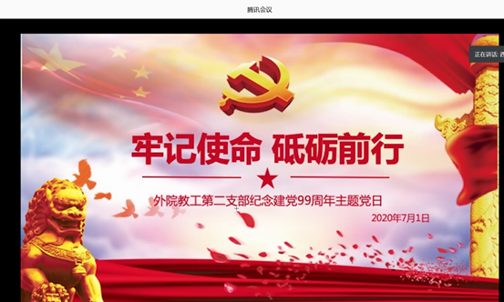 7月1日下午,外语学院教工第二党支部利用腾讯会议召开了牢记使命,砥砺前行——庆祝建党99周年主题党日”活动。活动由教工第二党支部书记崔花主持,二支部教师党员参加会议。与会党员结合疫情期间自身感受表达了对建党99周年的祝福。