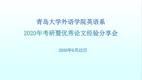 为增进考研经验交流,分享毕业论文写作经验,外语学院英语系于6月22日晚,在腾讯会议举行了2020年考研暨优秀毕业论文经验分享会。会上,杜琳、刘榛、常晨、王语涵、李宇涵等代表2020年英语系55位考研成功的同学,王梓钰、王鑫、周沫等代表今年荣获英语系优秀毕业论文奖的同学,向大家分享了自己考研的宝贵经验和毕业论文撰写的心得体会。英语系大二、大三同学和部分老师参加了会议,会议由英语系王薇副主任主持。