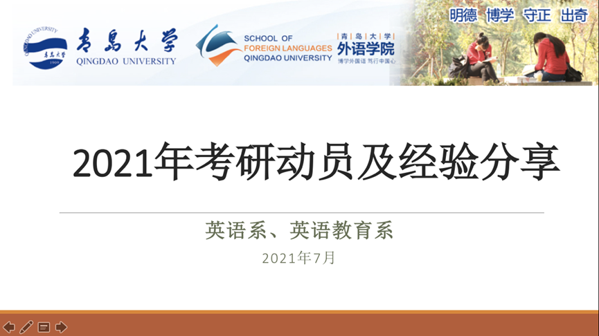 2021年7月15日下午,英语系、英语教育系在博文楼217教室联合举办考研经验交流会。本次交流会采取线上、线下结合的方式进行,五位成功考取硕士研究生的17级同学向英语系、英语教育系的近二百名学弟学妹们分享成功经验。青岛大学外语学院娄永强副院长、英语系邢富坤主任、吕云老师、王薇老师和英语教育系王进福老师为同学们简介了英语专业各方向的招生特点并做考研动员。