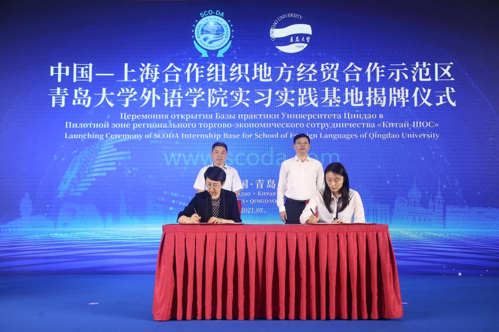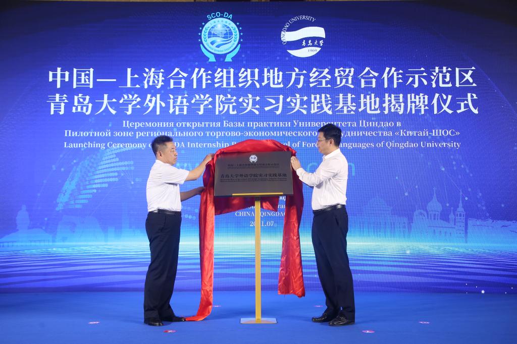 仪式上,校党委副书记杜方波、上合示范区党工委委员、管委会副主任孟庆胜、外语学院党委书记王传永、胶州市委宣传部副部长赵法文、胶州融媒体中心副主任任献文共同启动上合示范区五语种官方网站上线(试运行),外语学院院长卞建华与上合示范区管委商旅文化部部长夏鹏共同签署了共建实习实践基地协议,杜方波与孟庆胜共同为青岛大学外语学院实习实践基地揭牌。