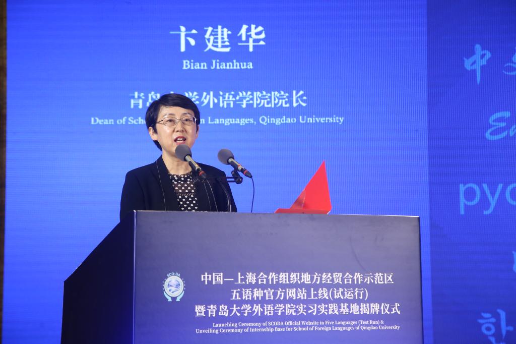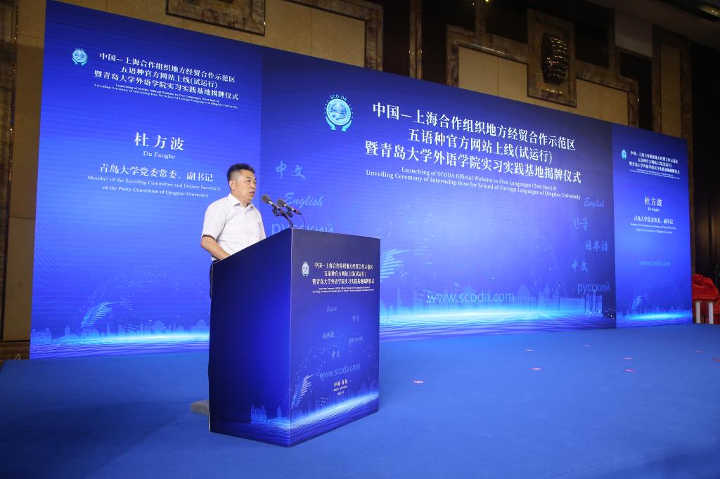 杜方波在致辞中强调,五语种网站上线(试运行)以及青岛大学外语学院实习实践基地的揭牌,是继上合经贸学院之后,我校与上合示范区深入交流合作的又一重要载体。为更好服务国家战略,今年学校增设了“上合英俄双语创新实验班”,旨在培养“精英语、懂俄语、通国情、善交流”的复合型拔尖外语人才,期待我校与上合示范区的合作不断结出累累硕果。