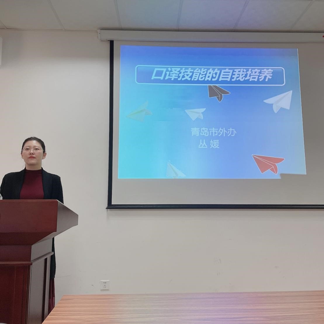 5月15日下午,外语学院在博文楼312举办了研究生行业发展前沿讲座,青岛市政府外事办公室对外友协处处长丛媛为老师同学做了题为“口译技能的自我培养”讲座。丛媛为外语学院翻译硕士校外导师,曾出访过英、美、德、法、印等二十多个国家,承担四百余场外事活动现场口译,具有丰富的翻译实践经验。英语系王昕老师主持讲座,外语学院教师和研究生60余人参加。