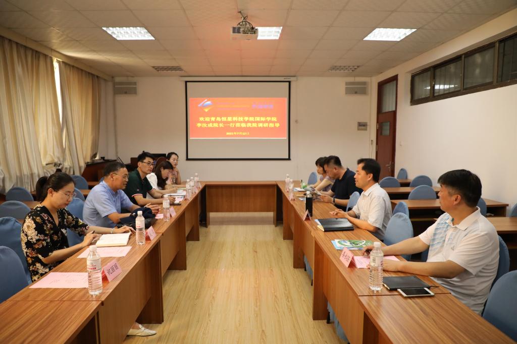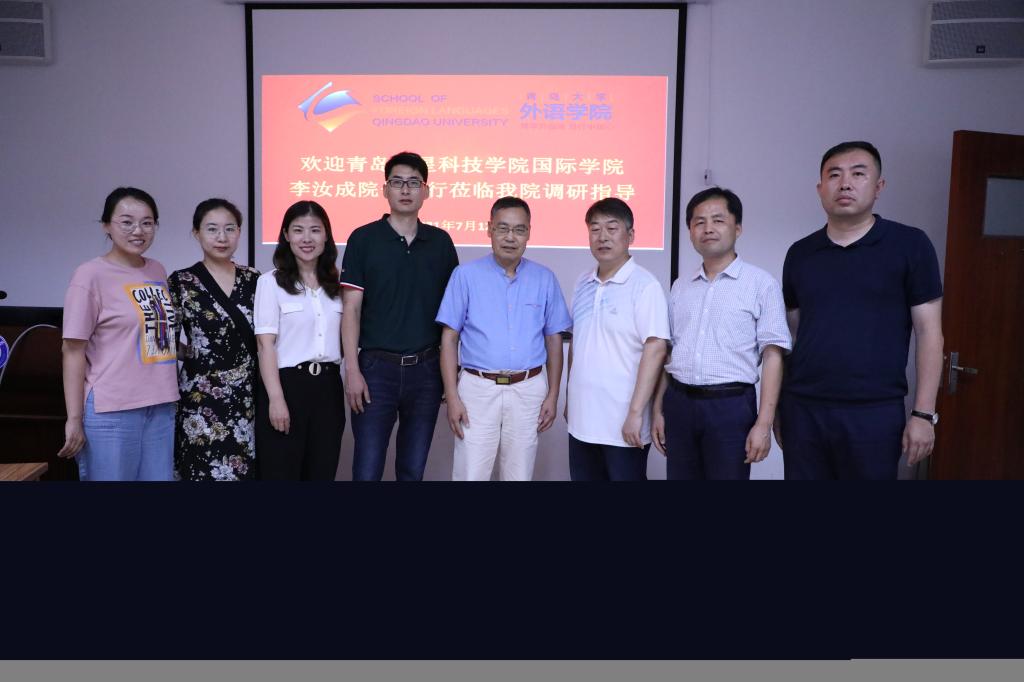 7月12日下午,青岛恒星科技学院国际学院院长李汝成教授一行来我院进行工作调研。外语学院副院长布占廷、娄永强,朝鲜语系副主任杨昊和本科教学办主任李兰参加调研交流。